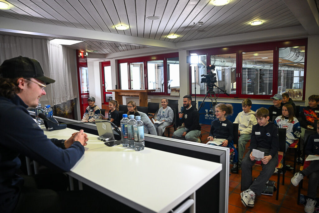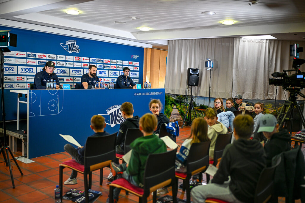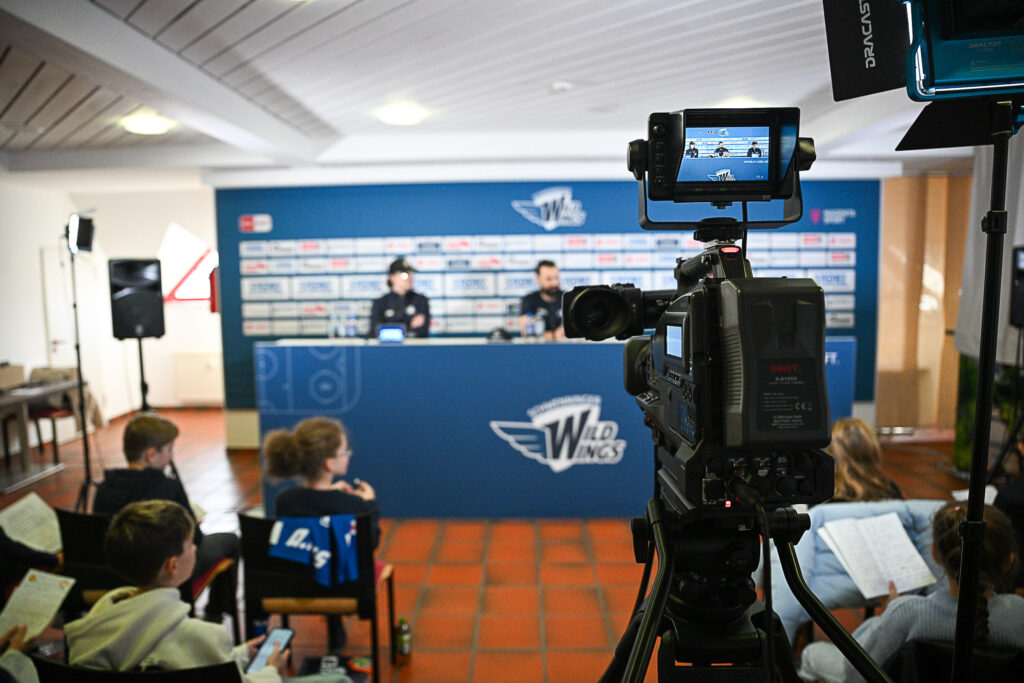 Kinder fragen – Spieler antworten. Vergangenen Dienstag fand unser erstes Kids Event statt: die Kinder Pressekonferenz im Mediencenter der Helios Arena. Grundschulkinder im Alter von 7 bis 11 Jahren konnten für einen Tag in die Rolle einer*eines Sportjournalist*in schlüpfen und WILD WINGS-Spieler Dominik Bittner, Phil Hungerecker sowie Håkon Hänelt mit ganz vielen Fragen löchern. Und dies meisterten die Kids wie die Großen. Mit vielen Notizen und toller Vorbereitung gestalteten die Kinder für alle einen unterhaltsamen sowie abwechslungsreichen Nachmittag, der von unterschiedlichen Themen, interessanten Insights der Spieler sowie ganz viel Humor geprägt war. Von persönlichen Fragen wie z.B. „Was ist euer Lieblingstier?“, über lustige Fragen wie „Was ist euer Lieblingswitz?“, bis hin zu Eishockey spezifischen Fragen wie z.B. „Was ist schwerer – ein Tor zu schießen oder ein Tor zu verteidigen?“ – die Neugierde der Kinder sorgte auch bei den Spielern für viel Begeisterung. „Es hat unglaublich viel Spaß gemacht. Die Kids haben so viele interessante Fragen gestellt und sich wirklich gut vorbereitet. Das ging teilweise sogar über den Blickwinkel von richtigen Sportjournalist*innen hinaus“, freut sich Dominik Bittner. Abgerundet wurde die Veranstaltung durch Autogramme und gemeinsame Fotos. Eins steht fest: Nach diesem Start können wir das nächste Kids Event kaum erwarten!