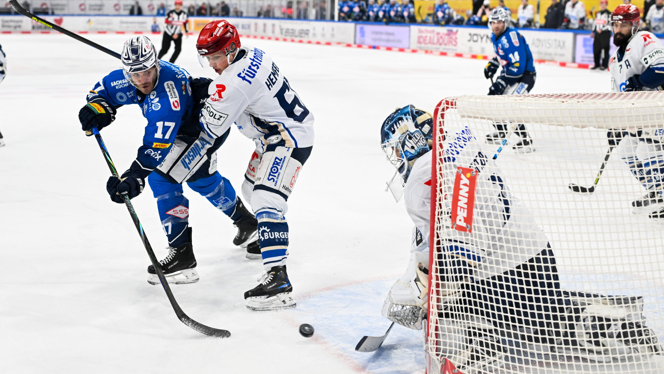 Minute 2: Nächste gute Chance der Eislöwen: Trevor Parkes befördert die Scheibe wenige Zentimeter am Gestänge vorbei.