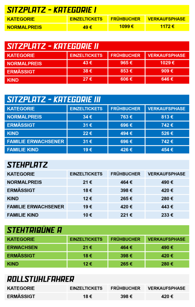 Neue Dauerkarten für die Saison 26|27 können ausschließlich für die Stehplatzbereiche gebucht werden. Für Sitzplätze stehen keine Kontingente mehr zur Verfügung. Die Ticketkategorie „Jugendliche“ gibt es zur neuen Spielzeit nicht mehr separat und wird nun unter „Ermäßigt“ geführt.